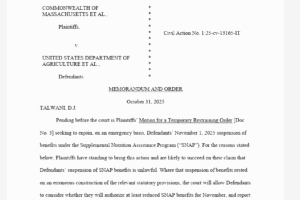 A federal judge in Boston ruled Friday that the Trump administration’s planned suspension of food stamp benefits for November is likely unlawful, finding that the Department of Agriculture misinterpreted federal law by claiming it could not access a $6 billion contingency fund appropriated by Congress for precisely this type of […]