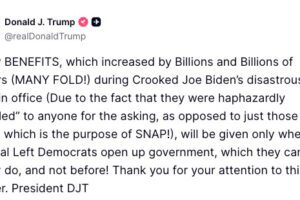 President Donald Trump sparked confusion Tuesday when he posted on Truth Social that SNAP benefits would only be distributed once Democrats end the government shutdown, shortly before White House Press Secretary Karoline Leavitt clarified that the administration is complying with a federal court order to provide partial food assistance. In […]
