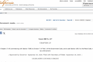 California Governor Gavin Newsom signed the No Secret Police Act (Senate Bill 627) on September 20, making it illegal for federal and local law enforcement officers to conceal their faces with ski masks, balaclavas, neck gaiters, and similar face coverings while conducting official business. The law takes effect January 1, […]