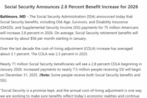 The Social Security Administration (SSA) announced today that millions of Americans receiving Social Security and Supplemental Security Income (SSI) will see a 2.8 percent increase in their benefits beginning in 2026, intended to keep pace with rising living costs. This annual cost-of-living adjustment (COLA) applies to approximately 75 million recipients […]
