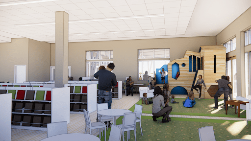 The centerpiece of the expansion will be a new 7,200-square-foot Children’s Library with a dedicated Teen Room. Story time sessions that can attract up to 70 children and parents are held in a meeting room that feels overcrowded on busy days. The new space will provide more room for children to read and participate in activities, and a glass wall will separate this area from the main library to reduce noise levels throughout the building.