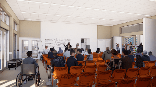 The Edgar Room, currently the library’s only meeting room, is booked daily for library programs and public use, often hosting multiple events in a single day. Phase 2 features the addition of a significantly larger meeting room that can be subdivided into two rooms, doubling the number of groups the library can serve.​
