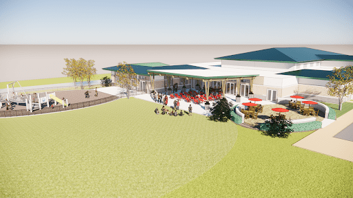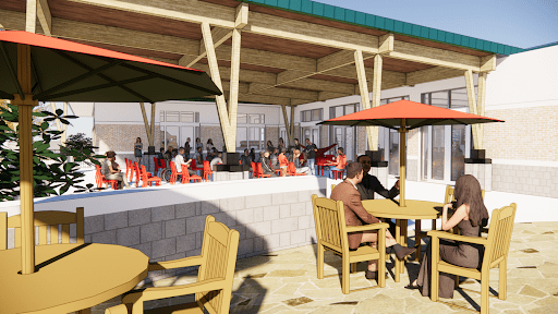 During the COVID-19 pandemic, library patrons showed strong enthusiasm for outdoor programming during warm-weather months. However, the library lacks shade to offer protection from the sun during these events. Phase 3 includes a covered outdoor patio with space for programs, concerts, and outdoor studying.