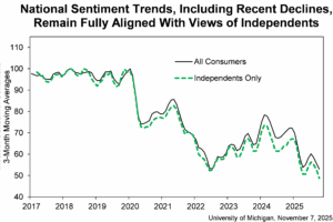 Americans are feeling increasingly pessimistic about the economy. A new survey from the University of Michigan shows that optimism about the future fell sharply in November, driven largely by anxiety over the month-long federal government shutdown and concerns about what it means for jobs and the economy. The Index of […]